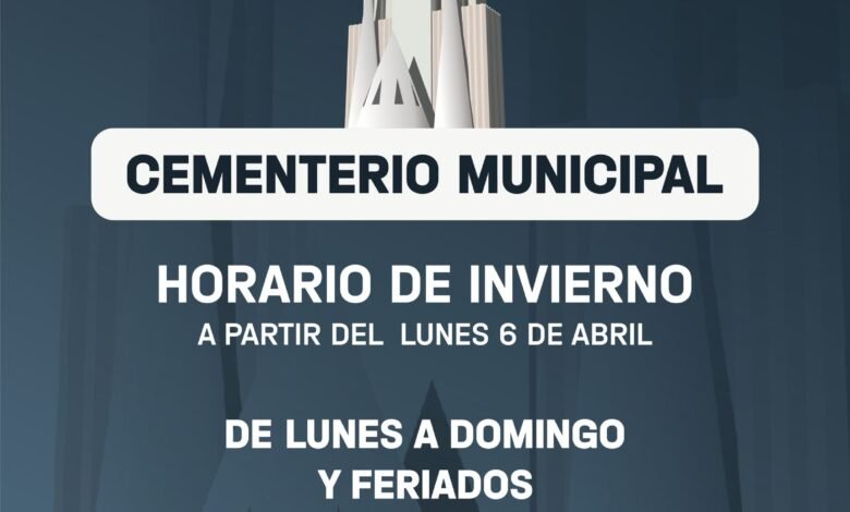 Inicio/Locales/Cementerio Municipal: cambio de horario Locales Cementerio Municipal: cambio de horario abril 5, 2026 Facebook X WhatsApp Cambio de Horario desde el lunes 6 de abril Horario de Invierno De lunes a domingo y feriados de 8.00 a 18.00 h abril 5, 2026 Facebook X WhatsApp Compartir Facebook X WhatsApp Compartir por correo electrónico Imprimir
