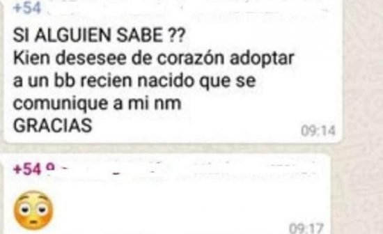 “Si alguien sabe, quién desease de corazón adoptar a un bebé recién nacido que se comunique a mi número. Muchas gracias”, dice el mensaje que envió al grupo la adolescente.