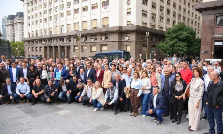 Intendentes de distintas partes del país, principalmente de la provincia de Buenos Aires y nucleados en la Federación Argentina de Municipios (FAM), se movilizaron este martes hasta el Ministerio de Economía, frente a Casa Rosada, para entregarle un petitorio al ministro Luis Caputo para pedir fondos retenidos, obras y una baja en el precio de las naftas.