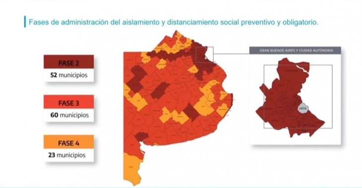 En la misma fase se encuentran otros 59 municipios, de los cuales 11 estaban en la fase 4 (donde solo quedan 23) y descendieron. Por su parte, 6 distritos del interior bonaerense pasarán a fase 2 de aislamiento desde este miércoles, entre ellos, Tandil, lo que implica la suspensión de las clases presenciales.