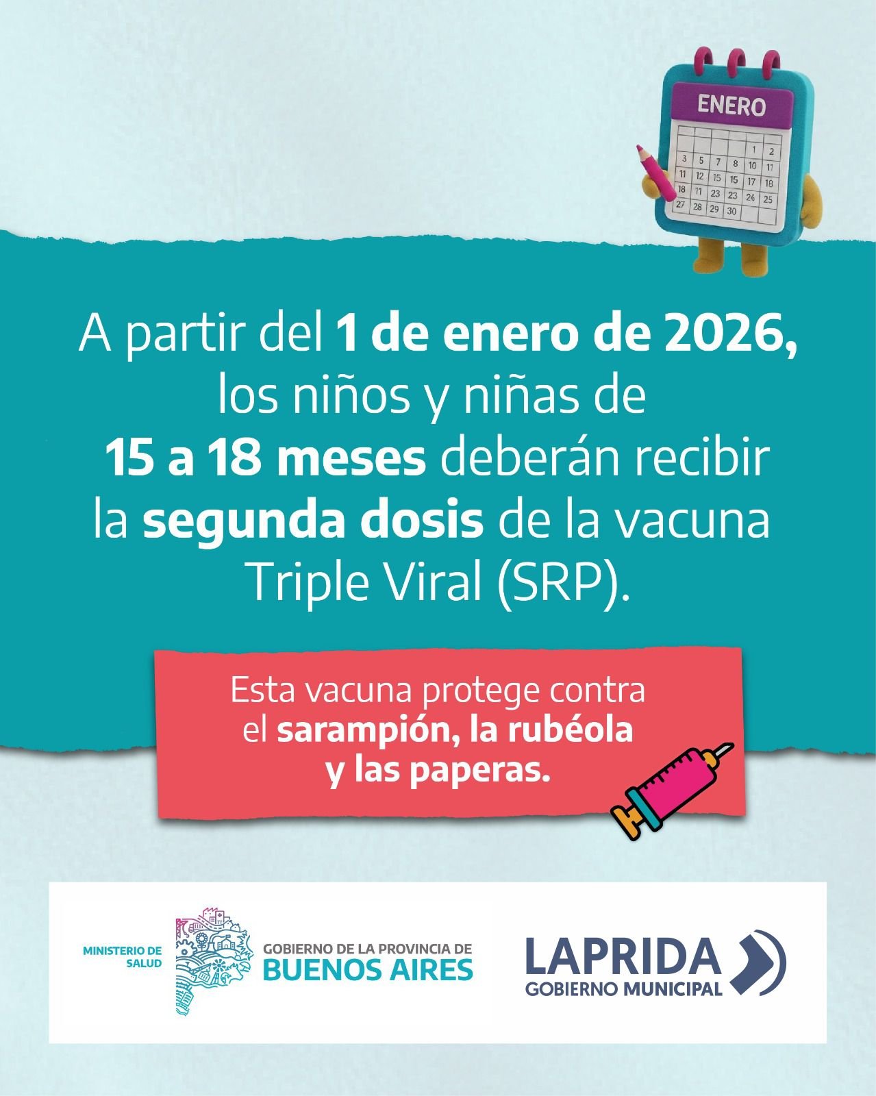 La Dirección de Atención Primaria de la Salud informa que, a partir del mes de enero, los niños y niñas de 15 a 18 meses, comienzan a recibir su segunda dosis de vacuna triple viral, que los protegerá contra sarampión, rubéola y paperas.
